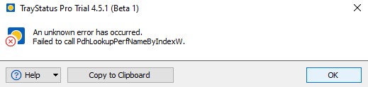 Windows 10 21H1 .. hard drive activity indicator crashes traystatus. Traystatus worked just fine until I installed the latest version of Windows 10. Version 21H1. All the indicators except hard drive activity seem to work but the hard drive activity will crash it. I am trying the latest beta version of traystatus.